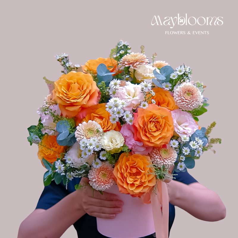 Giỏ hoa chúc mừng tone màu Hồng + Cam cắm trong hộp tròn 3/4 mặt.